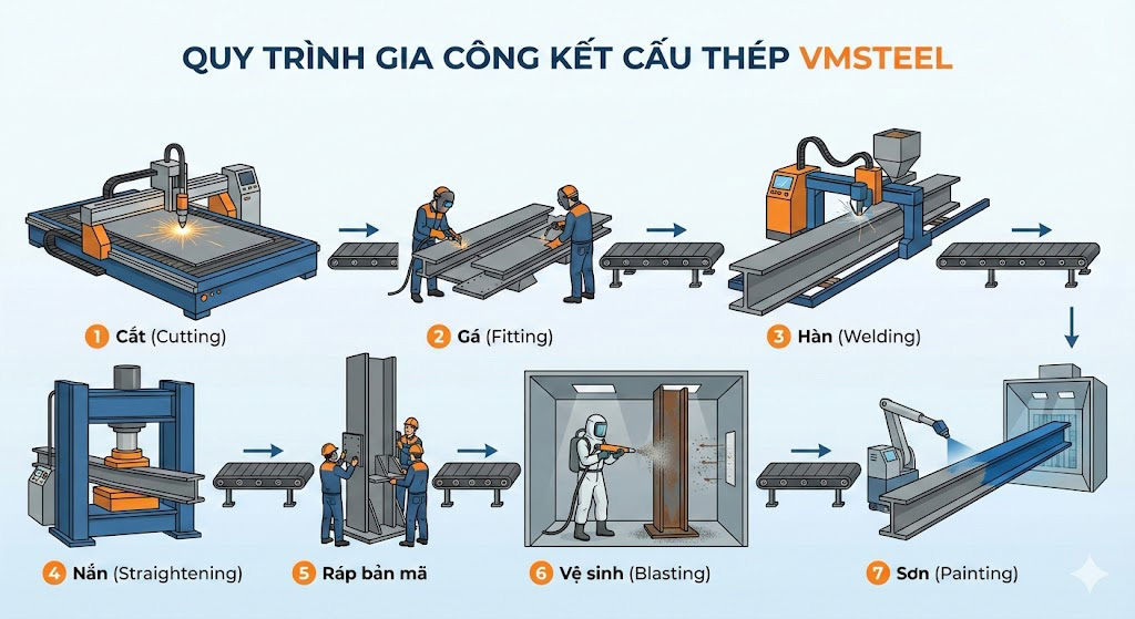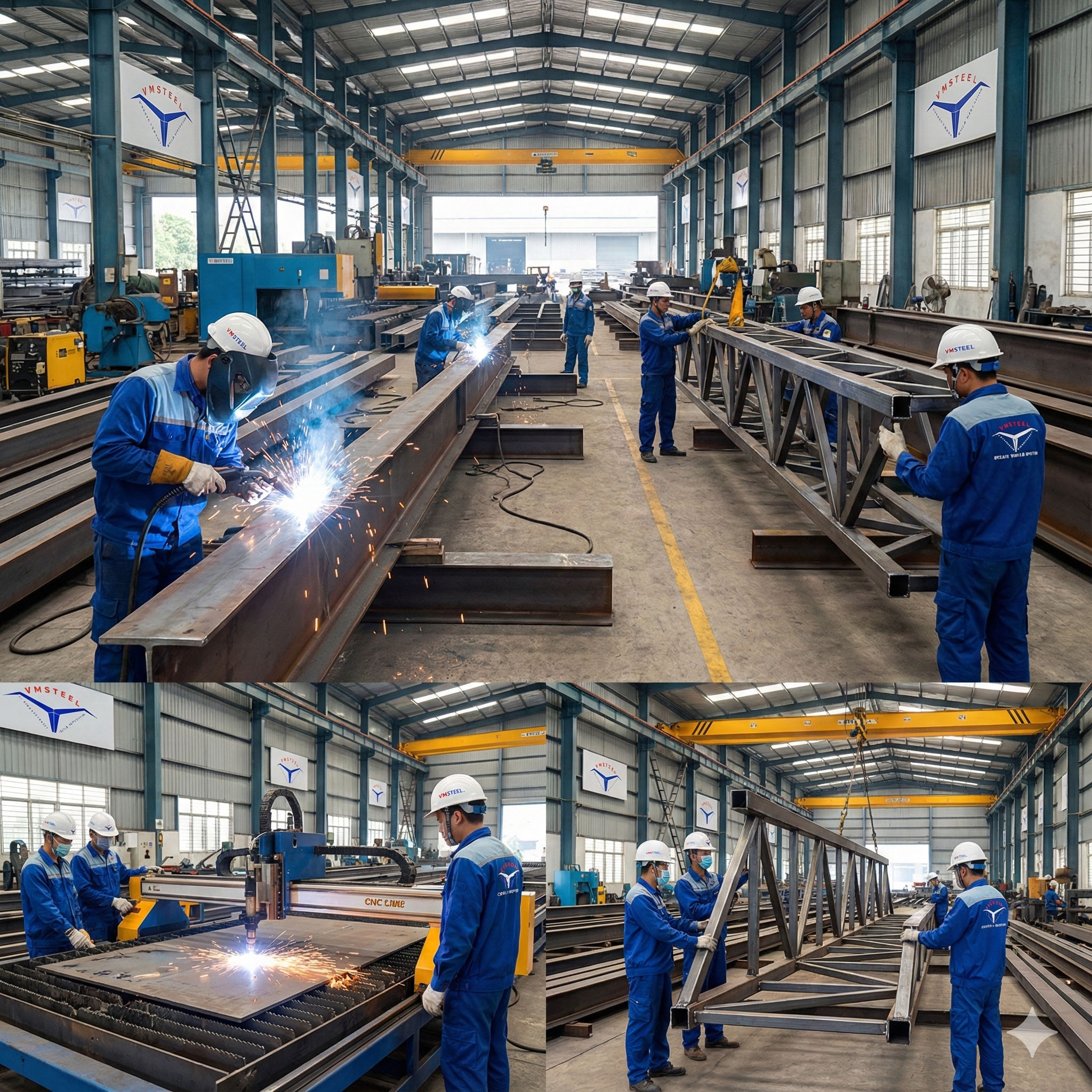 Hành trình của một cấu kiện thép tại nhà máy VMSTEEL phải trải qua 7 bước kỹ thuật cốt lõi, tuyệt đối không được đốt cháy giai đoạn:
